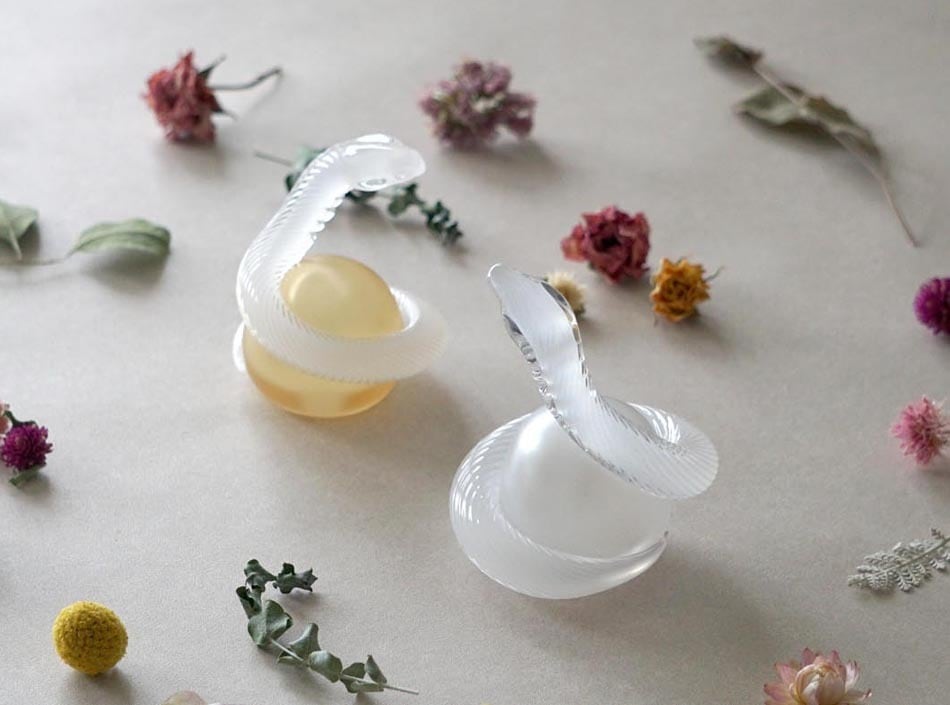 日本では、七福神の一人で財運や繁栄をもたらす弁財天の使いとされ、白蛇は特に縁起の良い生き物として知られています。そんな白蛇の神秘的な姿を透明ガラスで表現しました。