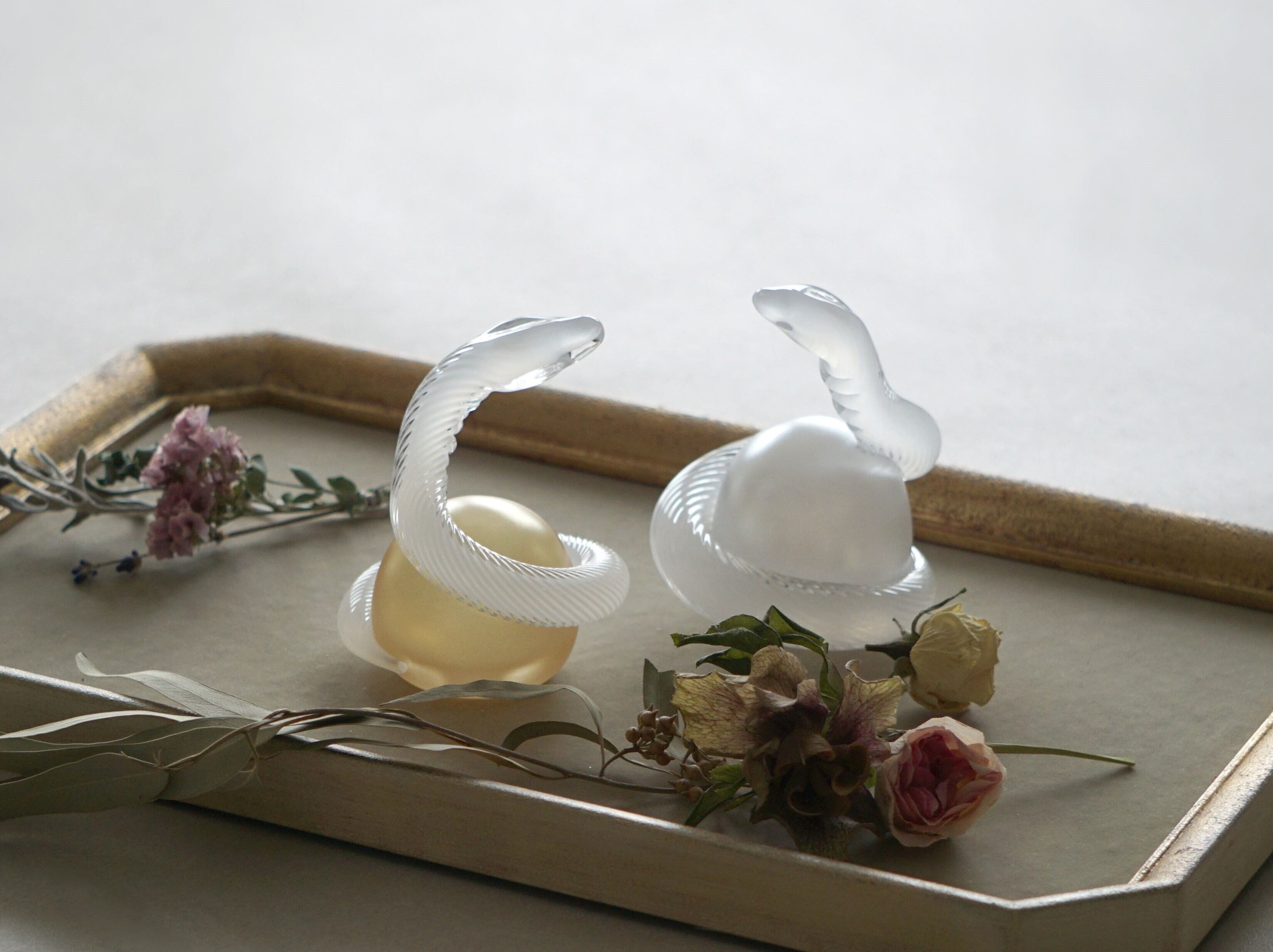 日本では、七福神の一人で財運や繁栄をもたらす弁財天の使いとされ、白蛇は特に縁起の良い生き物として知られています。そんな白蛇の神秘的な姿を透明ガラスで表現しました。