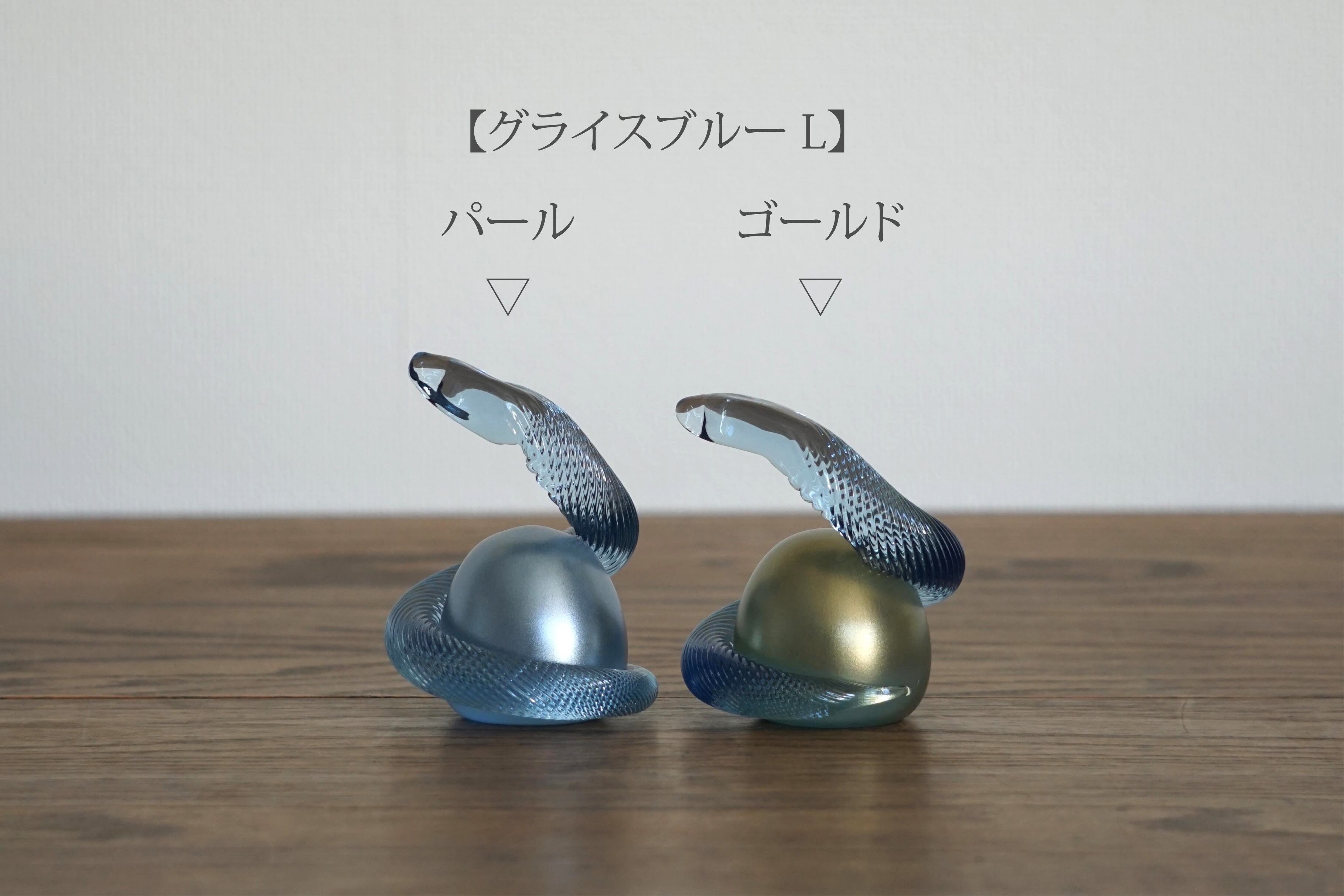 工房オリジナルの、お米を熔かしこんだ淡青のガラス「GRICE」(グライス)を使用した、瑞々しい装いの巳です。